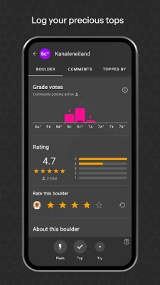 • TOPPING MATTERS: Every route you climb influences your personal dashboard. See your progress, strengths, grades, and—if you want—your ranking within the gym.